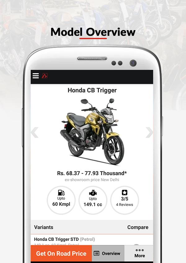 Going to buy a new bike? BikeDekho is the most useful and easy way to find out most suitable two-wheeler as per your requirements. The app provides you different features to search a two-wheeler of your need. Here you can get information about all the available models in India along with their ex-showroom as well as on-road prices. It provides various information about bikes including their variants with price list, overview, specifications, features, pictures, review and road test.